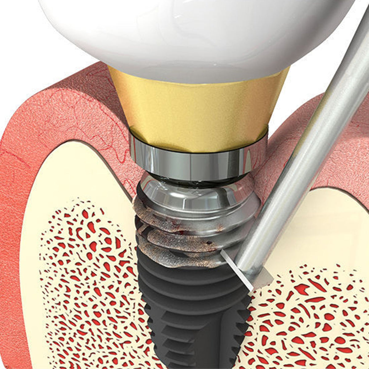 • Removes contamination through mechanical debridement, restoring the rough implant surface.
