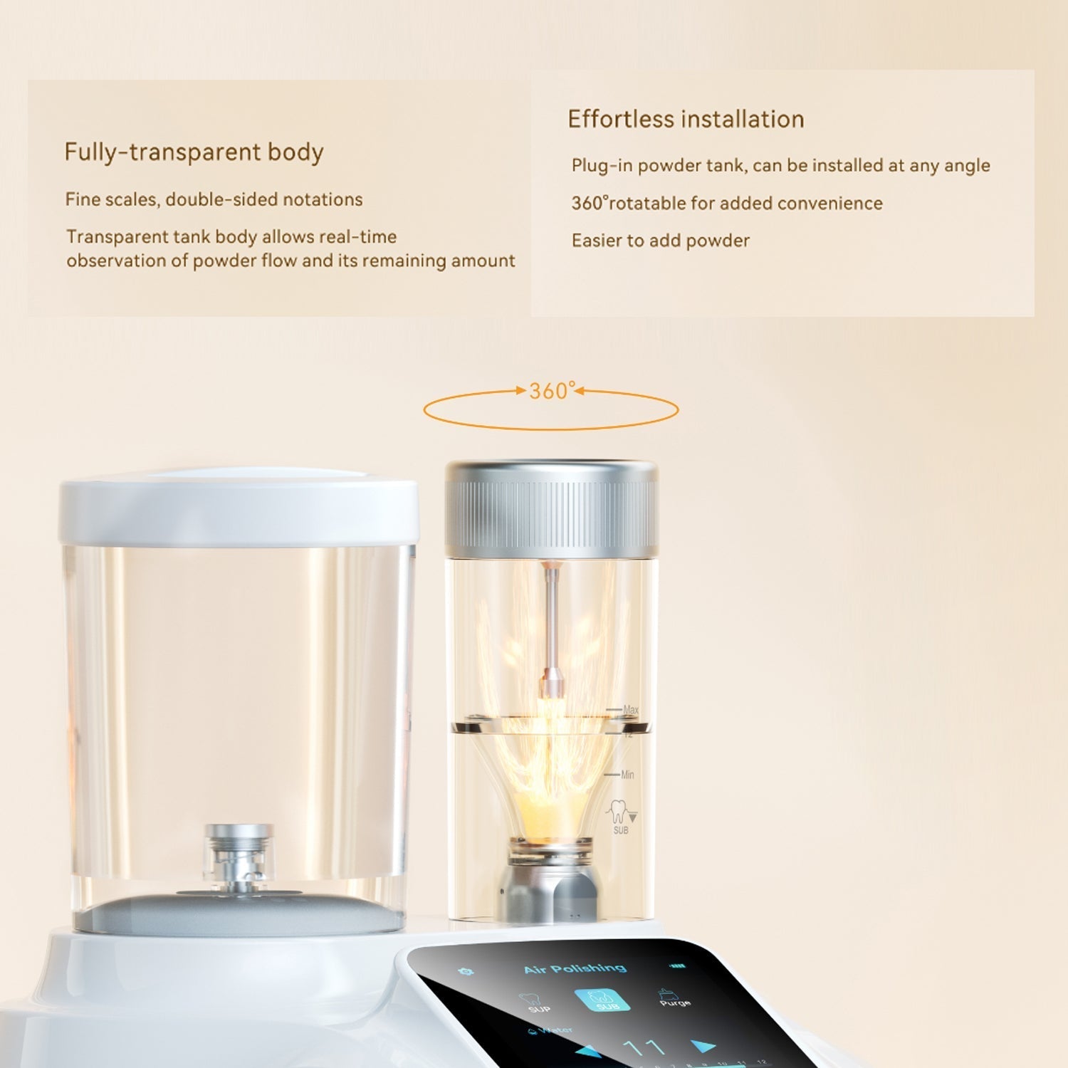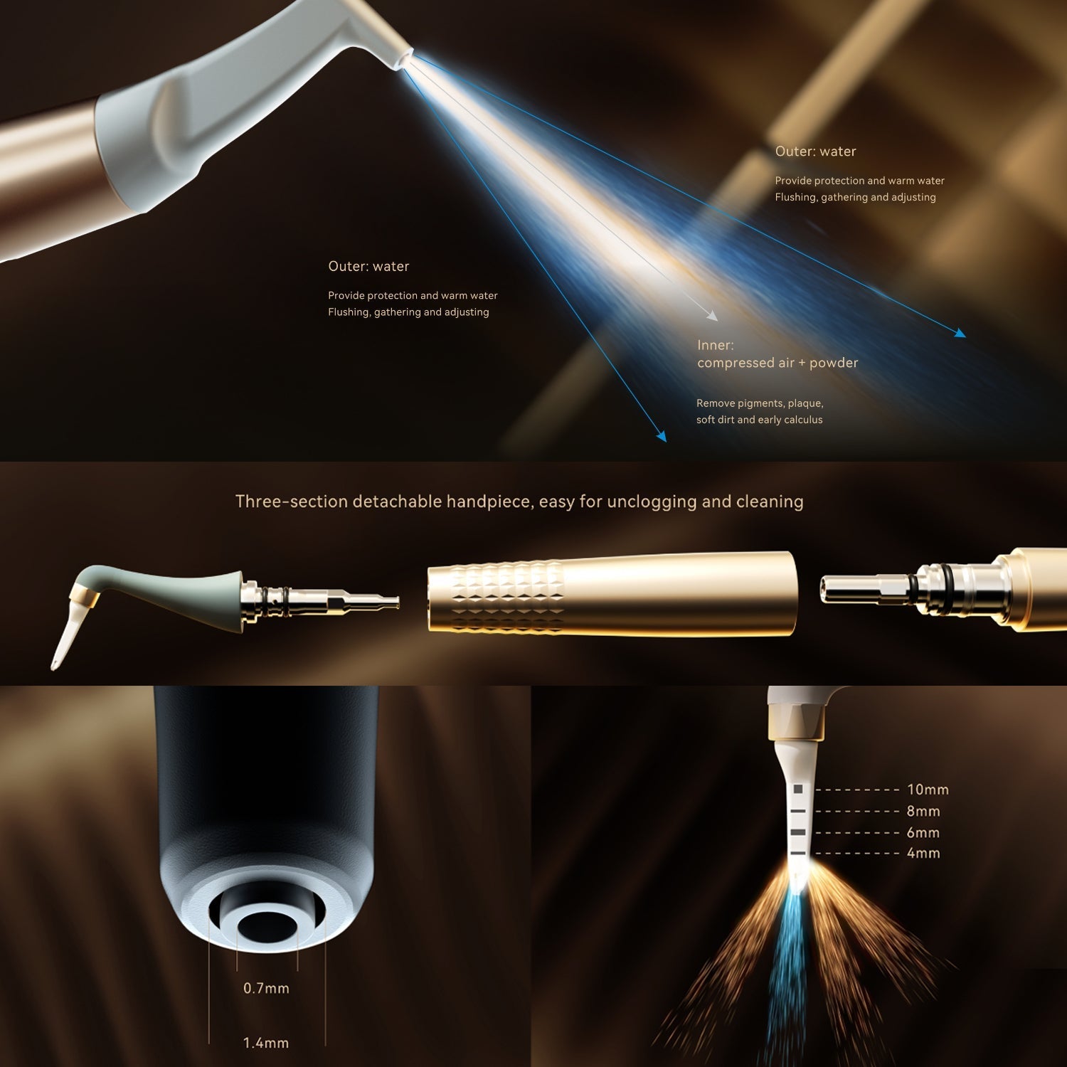 • Four temperature settings (25°C, 30°C, 35°C, and 40°C) to ensure a comfortable air polishing experience