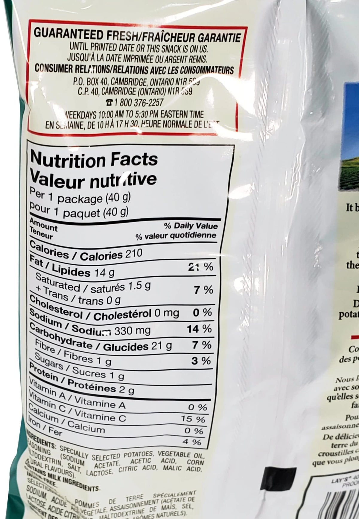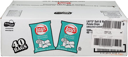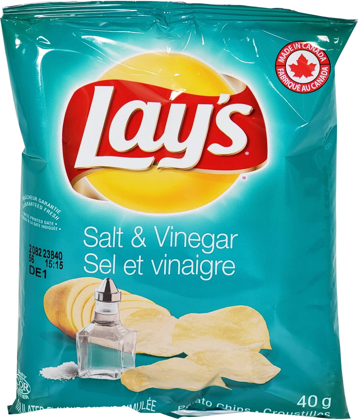 Details: Description Take a taste adventure with the bold bite of Lay’s® Salt & Vinegar flavoured potato chips. Seasoned with the robust flavour of tangy salt and vinegar, these chips have a crispy texture and a classic taste that pairs well with any meal. Savour the tangy flavour that's sure to get your taste buds hopping. A chip-lover’s favourite, this outstanding flavour is served up with the crispy and fresh taste of Lay’s®!