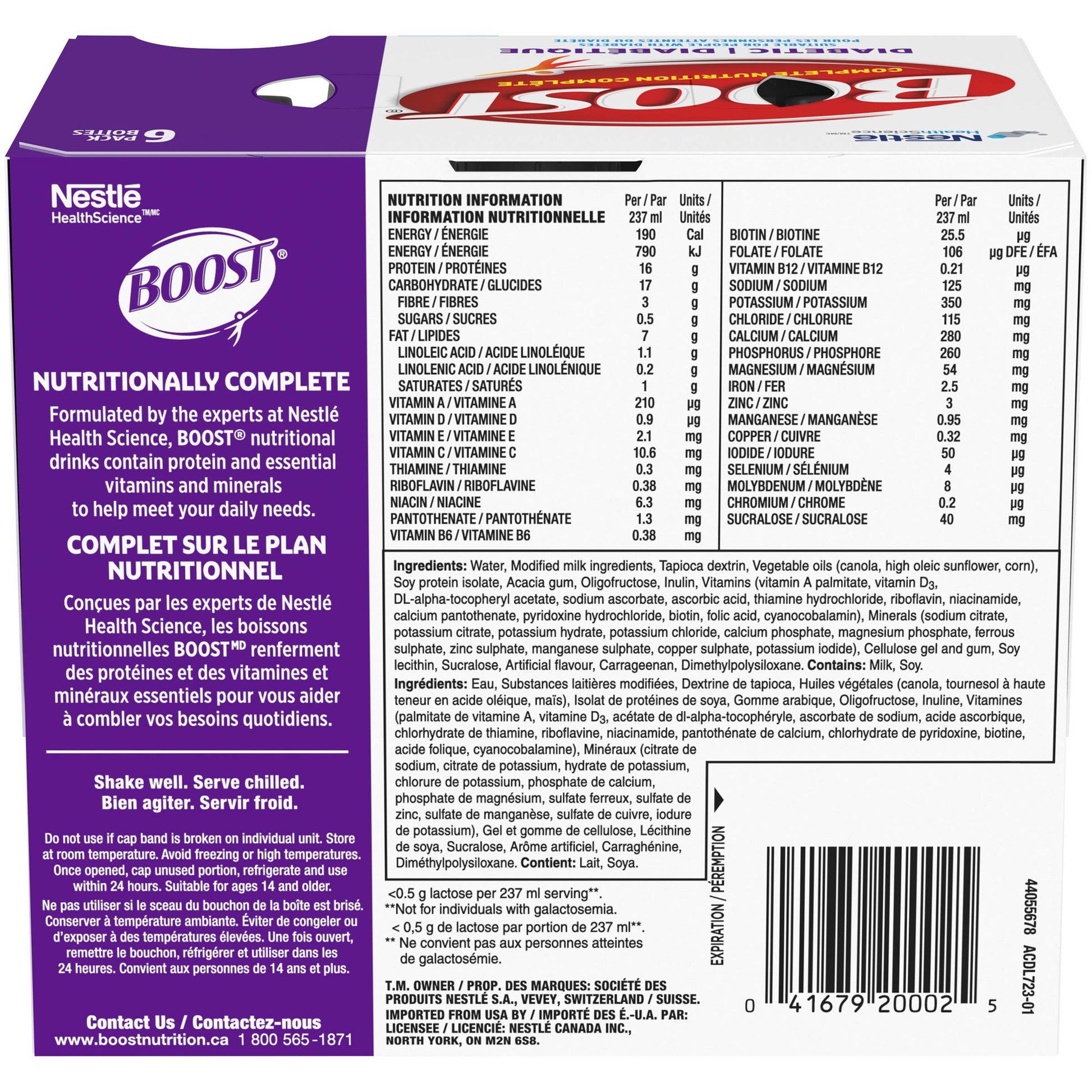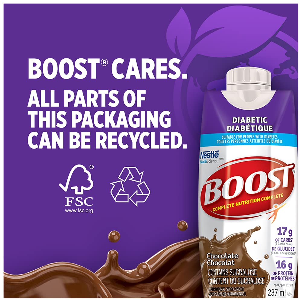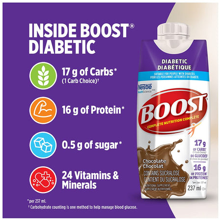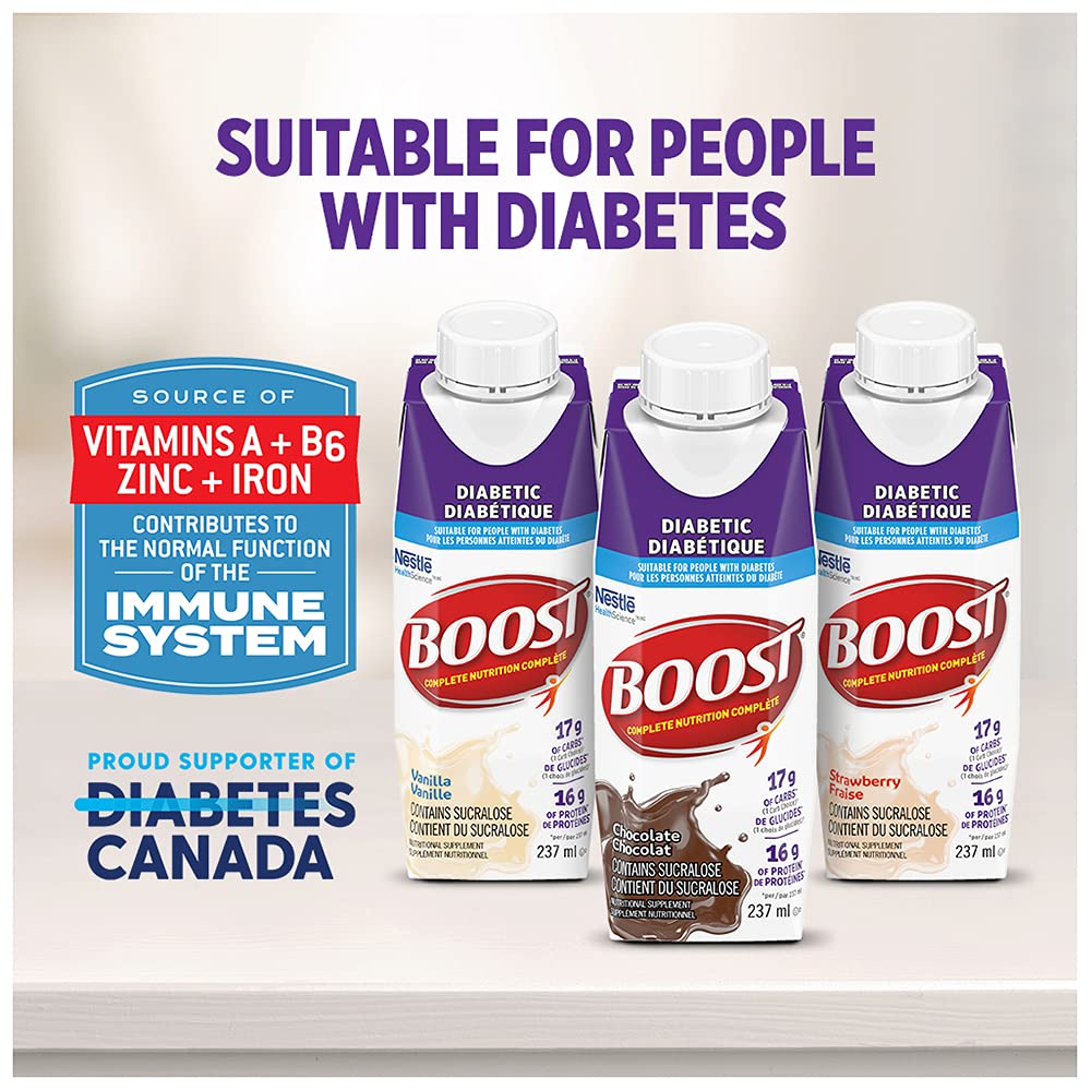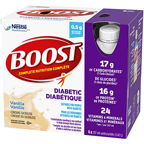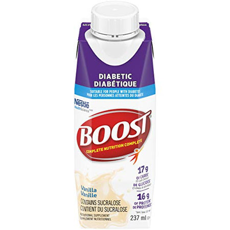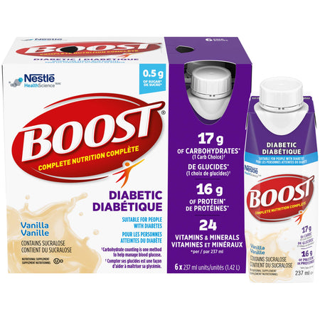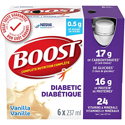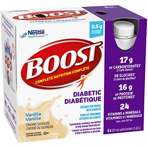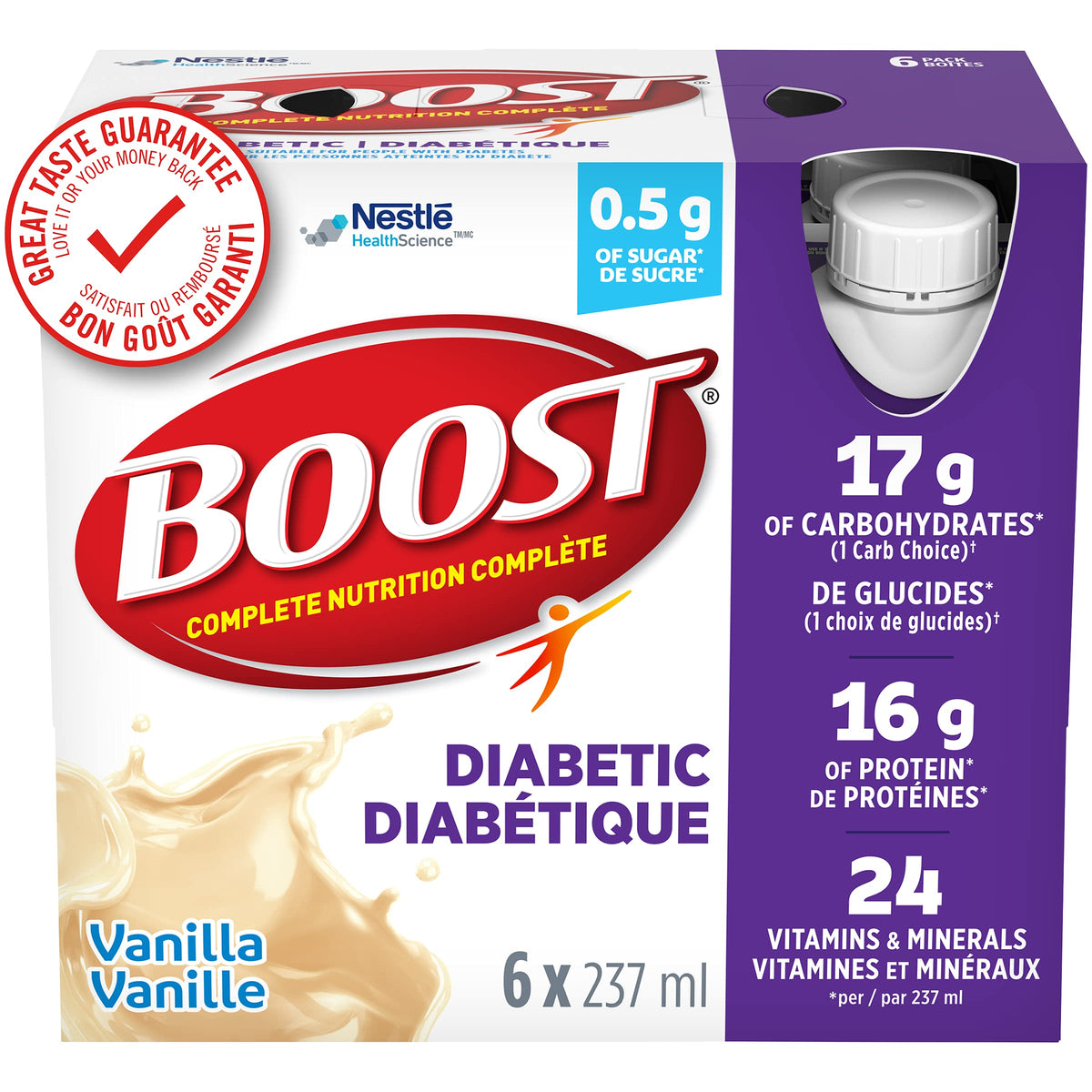 Details: Description BOOST Diabetic nutritional supplement drink is suitable for people living with diabetes at 1 carb choice per serving. It contains 24 essential vitamins and minerals, 3 g of fiber, 16 g of protein and 0.5 g of sugar per 237 ml serving. A complete balanced drink – BOOST Diabetic Nutritional Supplement – Vanilla (6 x 237 ml) can be enjoyed as a grab-and-go option that fits with your active lifestyle. We guarantee you'll love it or your money back.