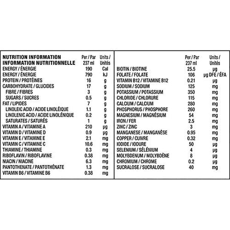 - Contains 16 g of protein, 0.5 g of sugar, 3 g of fibre and 17 g of carbohydrates per 237 ml to help provide a source of energy