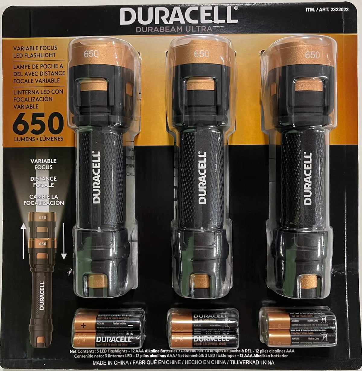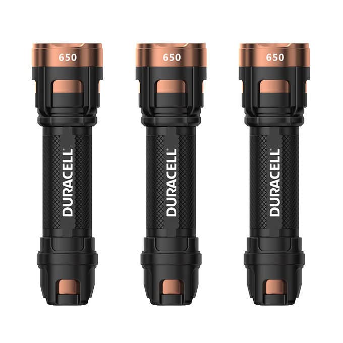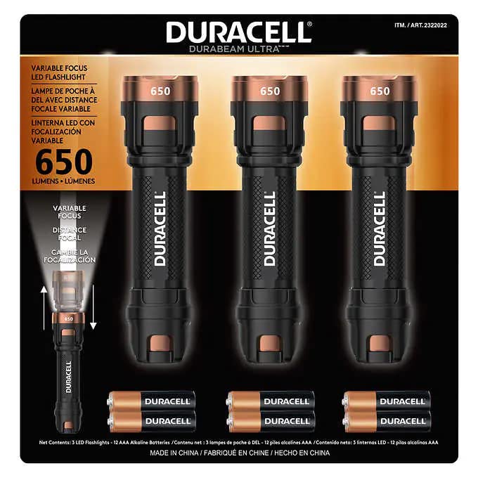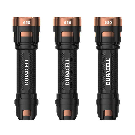 Details: This DURACELL DUREBEAM ULTRA variable focus LED flashlight is 650 lumens. The 6 in. longer size is perfect for hand carry. The durable housing is built by polymer and aluminum. It has 3 modes setting function. 3pcs flashlights per pack.