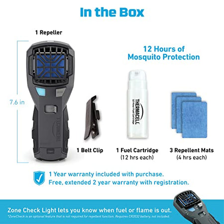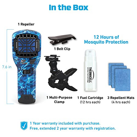- TURN IT ON… MOSQUITOES GONE: Thermacell MR300 Portable Mosquito Repellent creates a 15-foot zone of protection against mosquitos. In Mossy Oak Red Hook Camo, this repeller is ideal for fishing of all kinds, canoeing, kayaking, and more.