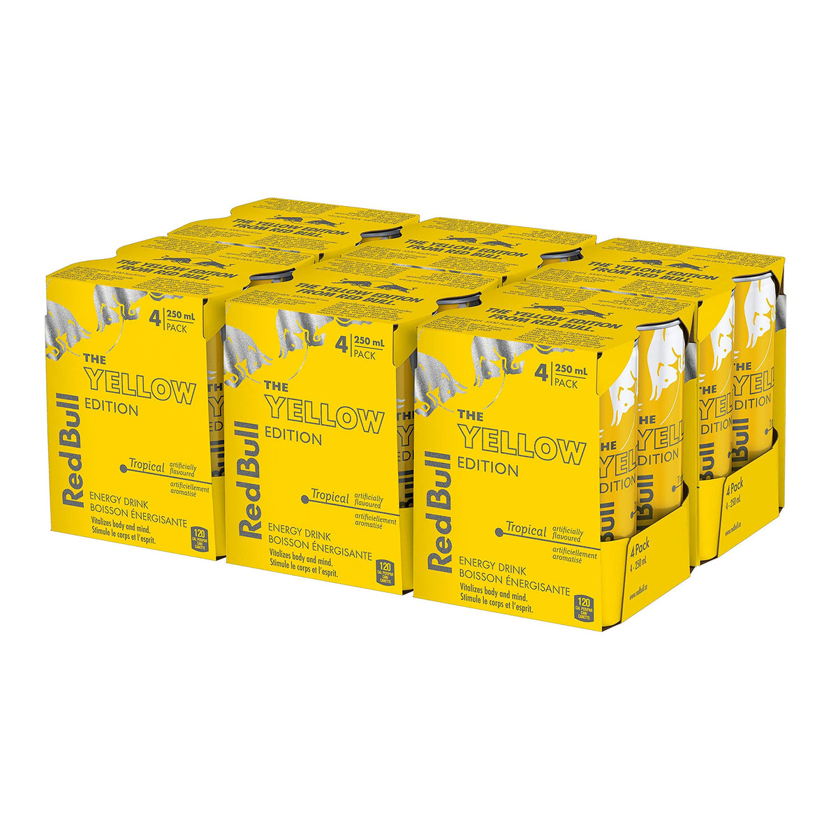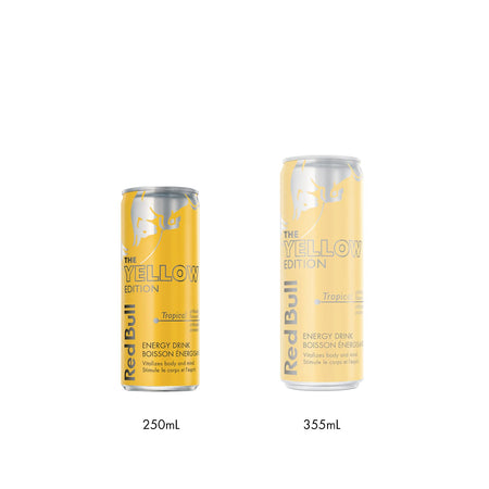 Details: Description Red Bull Tropical Edition's special formula contains ingredients of high quality: Caffeine, Taurine, B-Group Vitamins, Sugars, Alpine water One 250 ml can of Red Bull Energy Drinks contains 80 mg of caffeine, about the same amount as in a cup of home-brewed coffee. The amount of sugars in a can of Red Bull Tropical Edition is comparable to the level of sugars in an equivalent amount of apple or orange juice - 11 g per 100 ml. Red Bull cans are made of 100% recyclable aluminium One, 250 ml Red Bull Energy Drink, Tropical Edition can Vitalizes Body and Mind