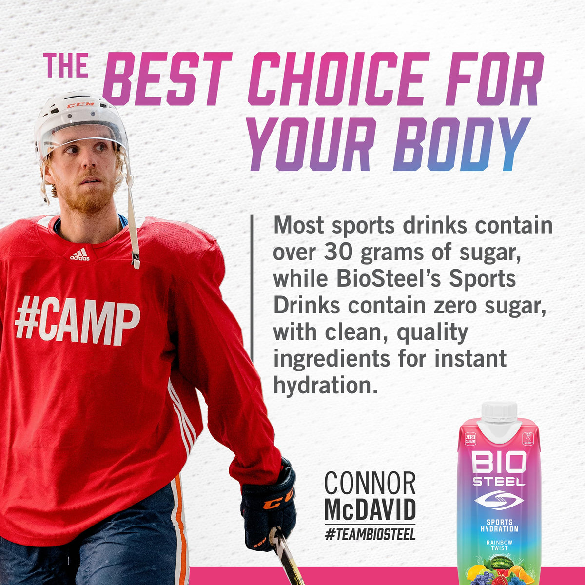 Details: Description At BioSteel, we discovered that top athletes were consuming energy drinks and so-called “clean” sports drinks loaded with mystery ingredients and stimulants like sugar and caffeine before and after games and practices. This led us to develop a new standard of quality for sports nutrition. The powerful combination of electrolytes, vitamins, minerals, and amino acids in Sports Drink helps to support optimal hydration throughout the day. Each serving contains sodium, potassium, chloride, calcium, and magnesium, all 5 essential electrolytes vital to optimal hydration. While water quenches your thirst, sometimes it’s not enough to replenish your body when dehydrated. A balanced ratio of electrolytes is needed to rehydrate efficiently and effectively. Additionally, our formula contains zero sugar because sugar can dehydrate more, defeating a sports drink’s purpose. Our Sports Drink is the perfect beverage to rehydrate anywhere you go. Since it’s ready to drink, you don’t need to worry about finding water to mix it with when you’re thirsty and need hydration. Sports Drink supports energy production and muscle strength and recovery, so keeping them handy wherever you are most active is ideal. You can feel good about using our products because our Sports Drink packaging is made with sustainable materials****. BioSteel’s mission is to create the most trusted sports hydration products on the planet. Whether you’re a pro-athlete, the next generation of athletes, a weekend warrior, or just living your everyday life, BioSteel is the better hydration option. The best-kept secret in sports is no longer a secret. Premium ingredients, product transparency, functionality, and authenticity—these values have helped us redefine and raise the bar for sports nutrition everywhere. *See full ingredients list **Certified Vegan, Nutrablend Foods Lancaster, NY, 3.22.2023 ****Sustainable Packaging Certified, Tetra Pak Denton, TX, 5.1.23
