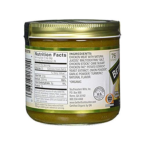 Details: Better Than Bouillon Organic Sodium Reduced Roasted Chicken Base, 76 Servings 2 PK x 16 Oz / 454 Grams, Total 32 Oz (Less Sodium) Better Than Bouillon Organic concentrated bases are made with 95% certified organic ingredients, and are made primarily from meat (or vegetables). This gives them a richer, more robust flavor than ordinary bouillon. No MSG, no fat, lower sodium: Better Than Bouillon bases are fat free and have less salt than ordinary bouillons. Less Sodium than our Regular Seasoned Roasted Chicken Base. Only 1 tsp. Better Than Bouillon = One Cube or One 8 oz. Can Broth.