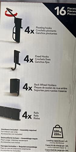 - 4X pivoting Hooks, Fixed Hooks, Back wheel holder, Rails