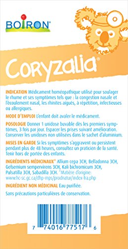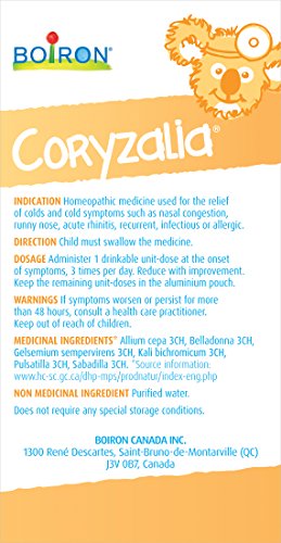 Details: Description Coryzalia relieves cold symptoms such as nasal congestion, runny nose and acute rhinitis in children ages 1 month and up. Available in easy to administer drinkable unit-doses, Coryzalia is sugar, dye, and preservative free. Parents and children alike will appreciate the ready-to-use, sterile water-based unit-doses, which are faster and easier to administer than ever. No mixing, no measuring, no fuss! And because they're a cinch to tote, they're a must for your travel bag as well as your home medicine cabinet.
