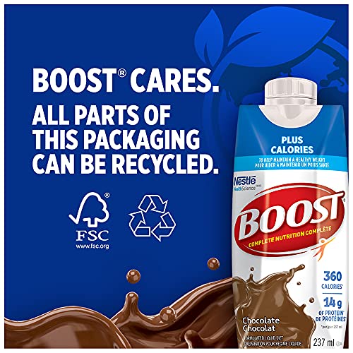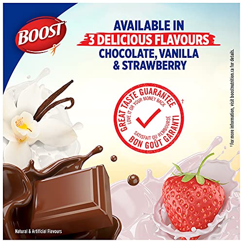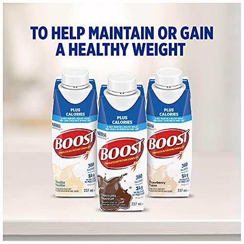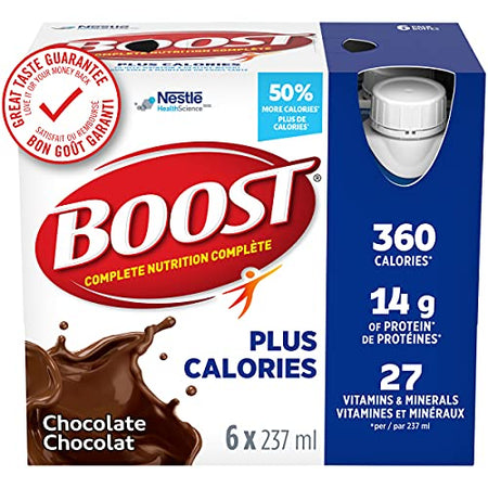 Details: BOOST PLUS Complete Nutrition Drink – Chocolate (6 x 237 ml) is a formulated liquid diet that provides complete nutrition and is designed for those looking for help to maintain or gain a healthy weight. Each serving contains 360 calories, 27 vitamins and minerals and 14 g of protein per 237 ml. Plus, our recipe has a guaranteed great taste you will love. Other flavors include Strawberry and Vanilla. For oral use. Use as directed by a healthcare professional.