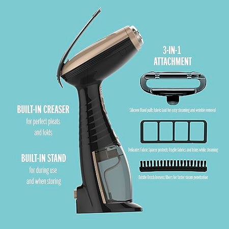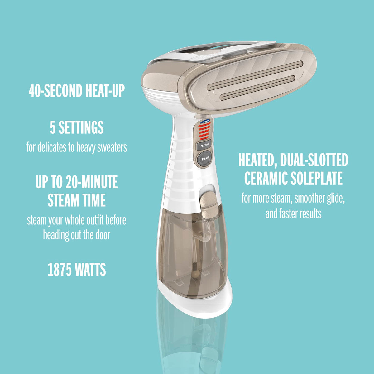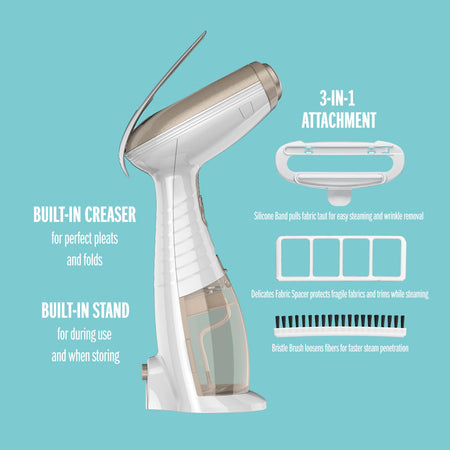 Details: Keep clothes wrinkle free and home fabrics fresh with the Conair Turbo ExtremeSteam Handheld Fabric Steamer! With its dual-slotted ceramic-coated sole plate, it’s engineered for more steam and faster results. It handles the toughest wrinkles, even on delicate fabrics, with ease. The 3-in-1 attachment lets you steam like a pro!