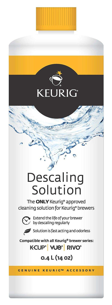 Details: Description The Keurig Descaling Solution keeps your Keurig brewer clean and free of calcium and scale to preserve the long-term health of your brewer. Works quickly and is odorless. 14 fl oz. Measures 2.25''L x 2.25''W x 7.75''H.