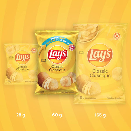 Details: Description Always fresh tasting, crispy and delicious, each bag of Lay's classic potato chips is made with specially selected potatoes and to the highest quality standards. Crispy and light tasting, Lay's classic potato chips were designed to put a smile on everyone s face, which makes them the perfect snack to share. Whether you keep a bag in your desk to complement your chicken salad sandwich at lunchtime or grab a bag to share at your next social occasion, Lay's classic chips will surely brighten your day! It s the classic snack tradition Canadians love!.