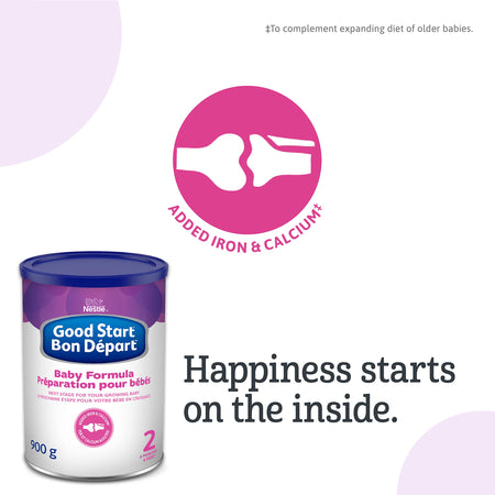 Details: Description The next stage in formula for your growing baby. GOOD START 2 Powder Baby Formula (900 g) is designed to complement the expanding diet of older babies, and contains added iron and calcium. Iron is important for making red blood cells, and calcium helps build strong bones and teeth. Just like our GOOD START Stage 1 formulas, GOOD START Stage 2 formulas contain COMFORT PROTEINS, which are 100% whey proteins that are partially broken down using our unique process for small tummies. Only GOOD START formulas contain COMFORT PROTEINS™. This non-GMO