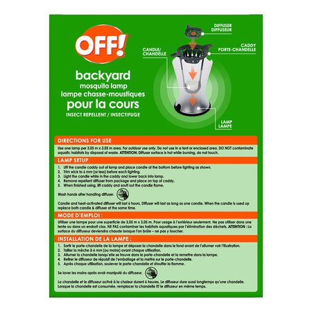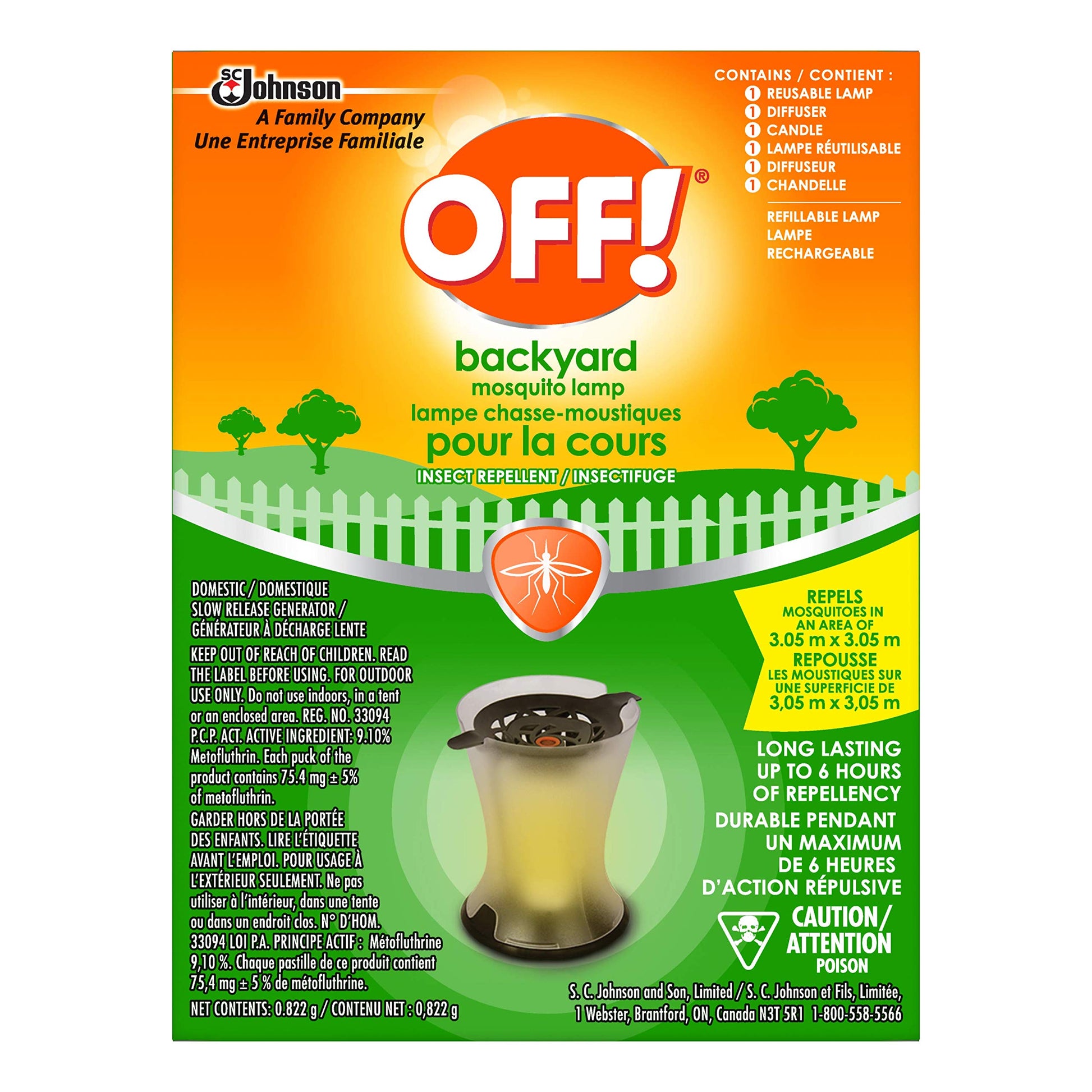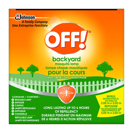 Details: Description Protect your outdoor space with OFF! Mosquito Lamp. The heated pad releases an insecticide that effectively repels mosquitoes for up to 6 hours. Protect any outdoor party, shindig, or festivity with the OFF! Mosquito Lamp, while maintaining the ambiance of your outdoor space. Each OFF! Mosquito Lamp lasts for up to 6 hours, providing long lasting protection. Just light it and relax, simply activate the diffuser by lighting the candle. OFF! Mosquito Lamp is designed for your outdoor patio area and repels mosquitoes in an area of 3.05m x 3.05m. Don’t let mosquitoes ruin your summer.