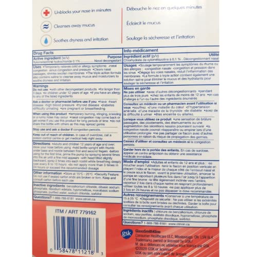Details: Description Pack of 2 Otrivin Nasal Spray for Adults with 3 in 1 Triple Action Formula Cold and Allergy Decongestant Measured Dose Mist Complete Nasal Care Otrivin Lot de 2 vaporisateurs nasaux pour adultes avec formule triple action 3 en 1 pour le froid et les allergies décongestionnant dose dose dose complète soin nasal