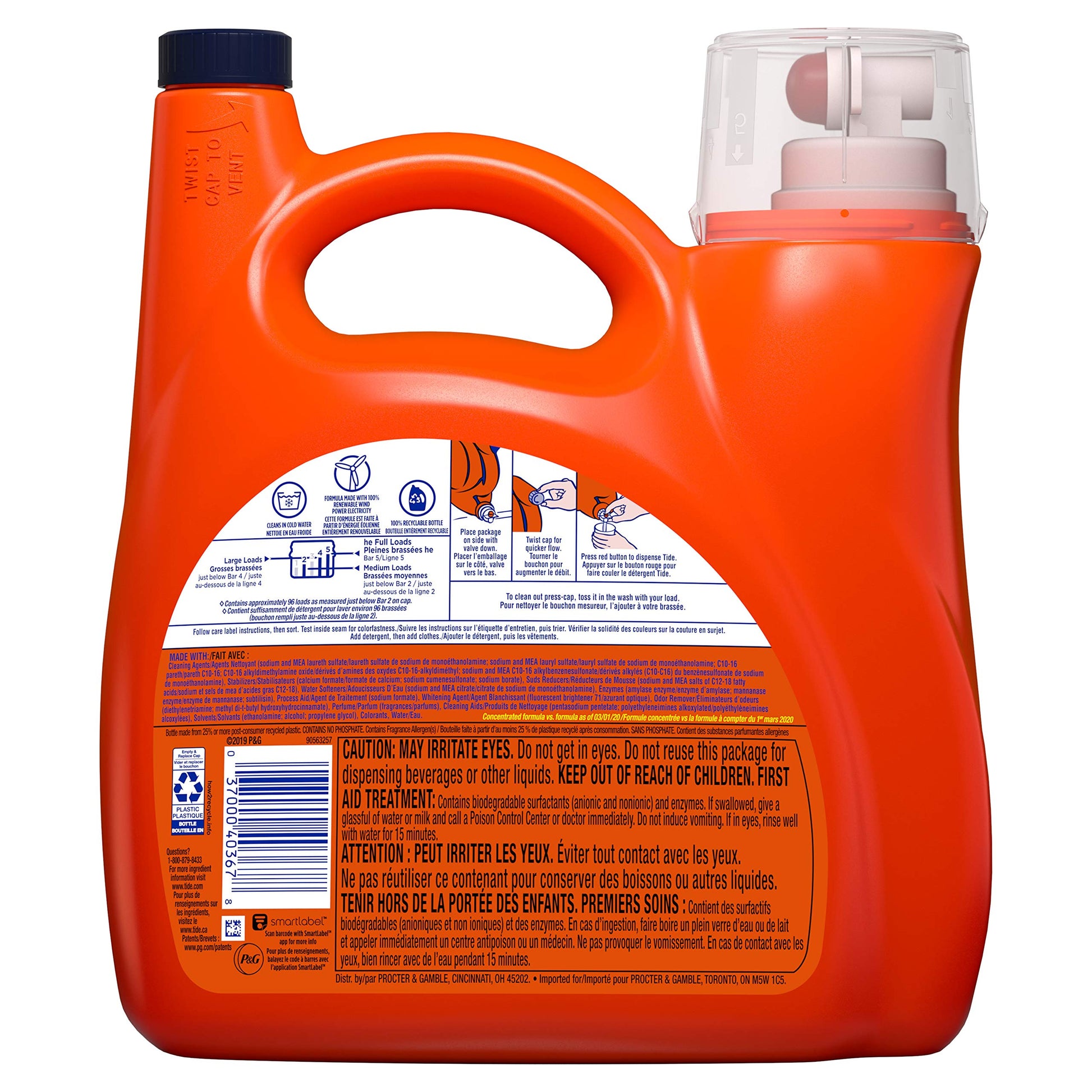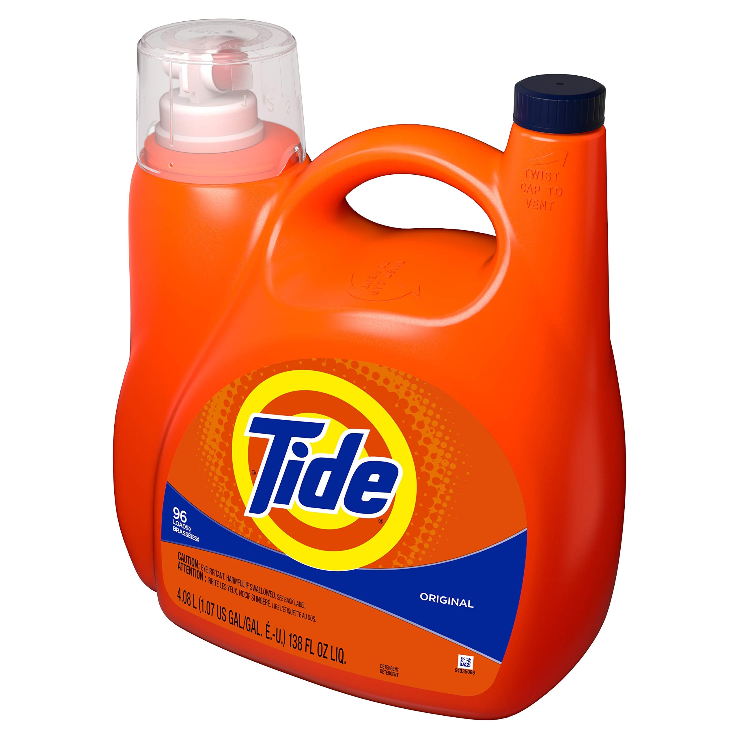 Details: Description Tide Original liquid laundry detergent provides the Tide clean you love, now more concentrated for more stain removal and freshness and less water. America's #1 detergent is specifically designed to cover your many laundry needs. Also try our small but powerful Tide pods laundry pacs. Measure your loads with cap. For medium loads, fill to bar 1. For large loads, fill to bar 3. For HE full loads, fill to bar 5. Add clothes, pour into dispenser, start washer. Vs. Previous formula based on sales.