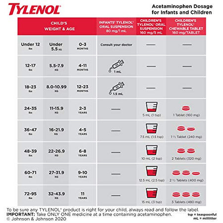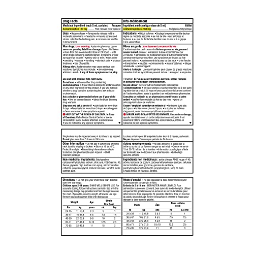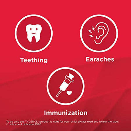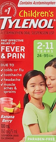 Details: Description Children's TYLENOL Acetaminophen Suspension Liquid' quickly relieves children's fever and pain symptoms due to teething, immunizations, headache, mild to moderate aches, minor muscle sprains and strains, colds, or flu. What's more, Children's TYLENOL won't upset little stomachs. Children's TYLENOL Acetaminophen Suspension Liquid has a banana berry flavour that kids enjoy and comes in a 100-millilitre bottle