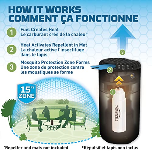 • No-DEET or On-Skin Chemicals – Original, No Odour Thermacell Mosquito Repellent delivers effective no-spray zone of protection covering 15-ft zone; protects against mosquitoes without the mess