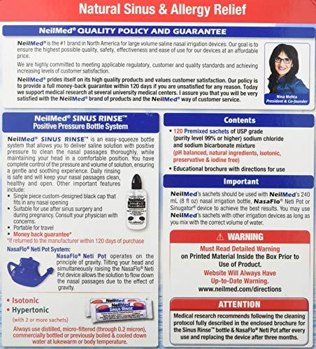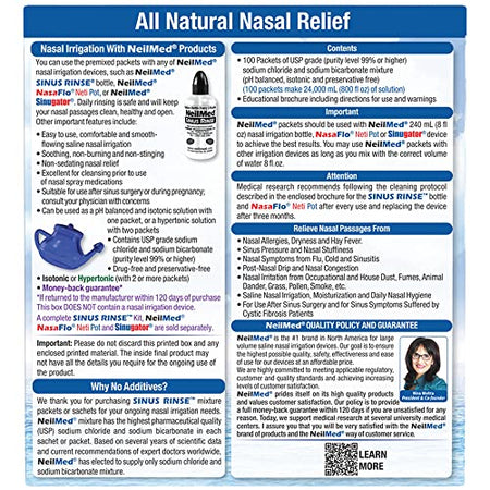 Details: Sinus rinse? regular mixture packets: 100 regular premixed packets of pH balanced sodium chloride & sodium bicarbonate mixture (USP grade, natural ingredients, isotonic, preservative free & iodine free), 1 full color illustrated educational brochure. If.