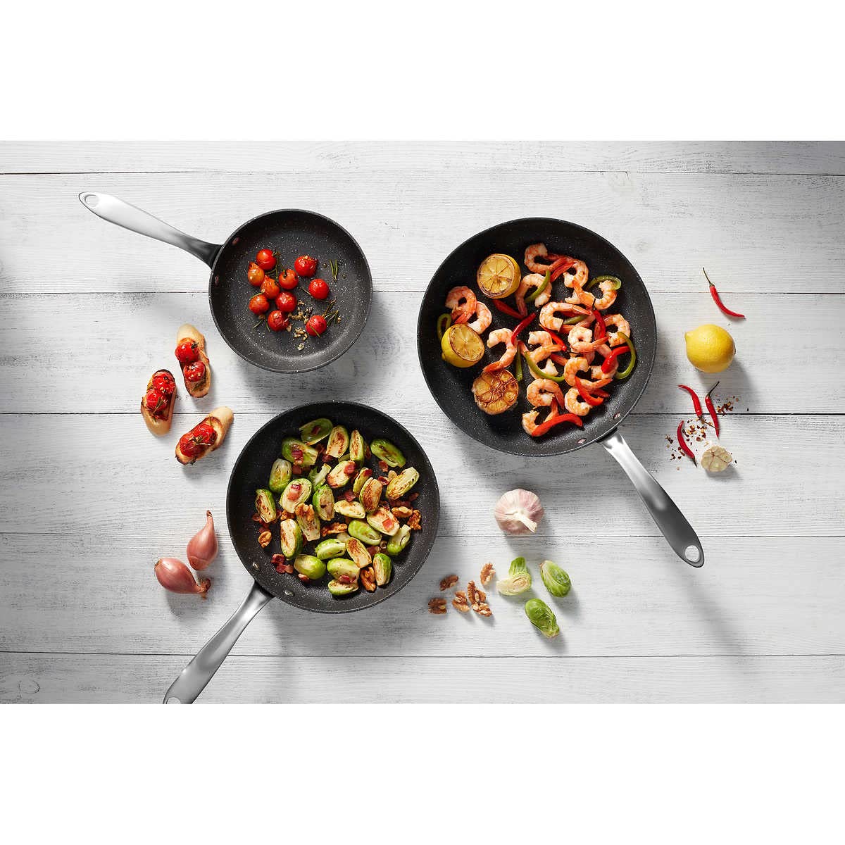 • The Rock 3-piece skillet set is all you need in your busy life and busy kitchen. It comes in 3 different sizes, perfect for cooking small side dishes to full meals
