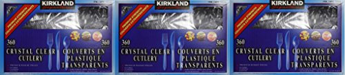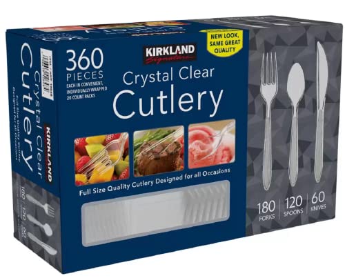 Details: Premium strength crystal clear cutlery contains 360 premium weight pieces - 180 forks, 120 spoons and 60 knives, each in convenient, individually wrapped 20 count packs. Quality cutlery, designed for all occasions, banquets, parties, upscale catering, at home.