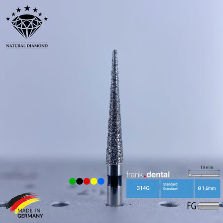 Diamond dental burs: Diamond is the hardest natural material known to man and, therefore, is the material of choice when it comes to wearing down the hardest tissue in the human body: tooth enamel. Diamond burs have a steel shank and an active part coated with natural or synthetic diamond powder. The vast majority of commercially available dental burs are made of synthetic diamond and it is less common to come across natural diamond burs. Manufacturers who use natural diamond usually emphasise this characteristic, as it gives the burs greater quality, efficiency and durability. Of course, the cost of a natural diamond burr is higher than that of a synthetic diamond burr.