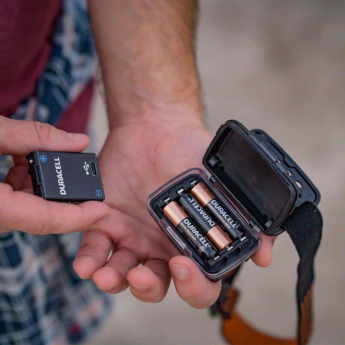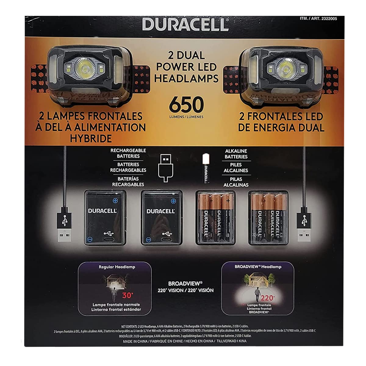 - Never run out of light again with Duracell's latest Dual Power LED Headlamp 2 pack. These headlamps pack a powerful 650 lumens, 220 degrees of beam area and 9 modes. Power with the rechargeable battery or the 3 included AA Duracell Batteries. With a 5-Position tilt, IPX8 Waterproof Rating, 1 Meter Drop Test and adjustable headstrap, you can wear this headlamp anywhere and use for a variety of situations.