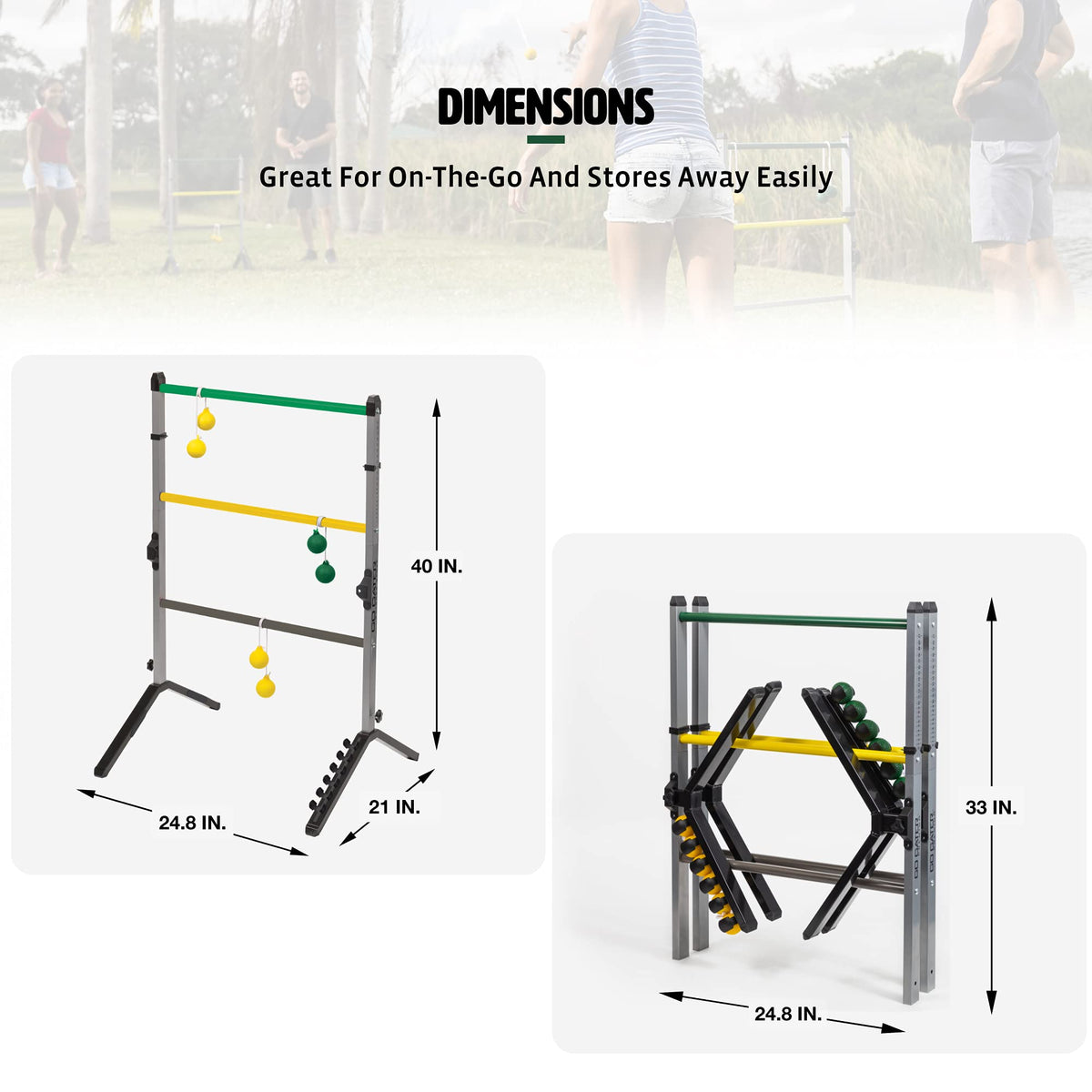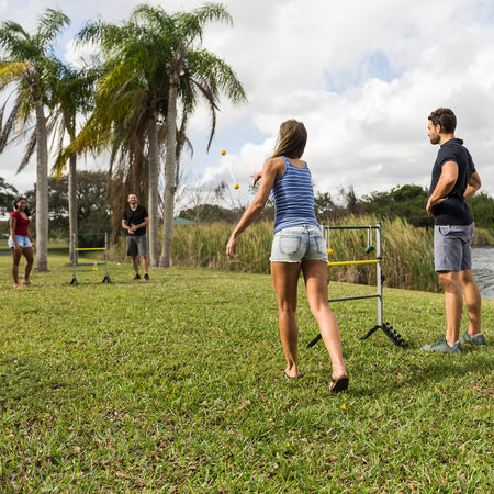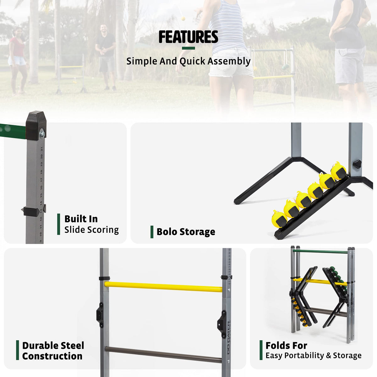Details: The Go! Gater Steel Ladderball Set is the premium edition of a classic, team-play outdoor game. Engineered with durable and portable design for lasting performance season after season. Easy to set up and take down, the portable construction enables you to bring your ladderball game to every barbeque and party. Never lose track of who's winning with the built-in scoring slider! So grab your family and friends, and relax with some competitive play that's perfect for all ages and skill sets.
