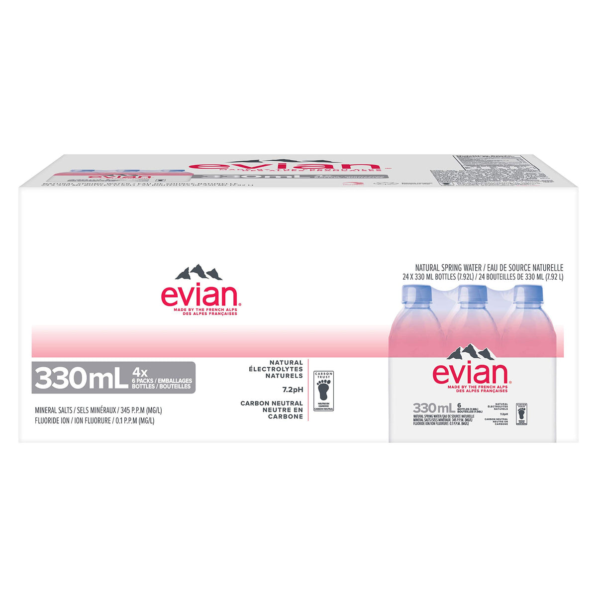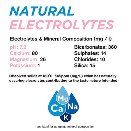 - Natural hydration: evian starts in the French alps, delivering hydration and naturally occurring electrolytes that contribute to taste. It's a great way to rehydrate post-workout, at lunch or at work