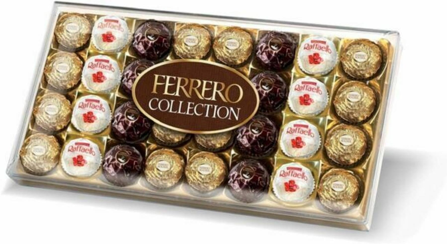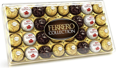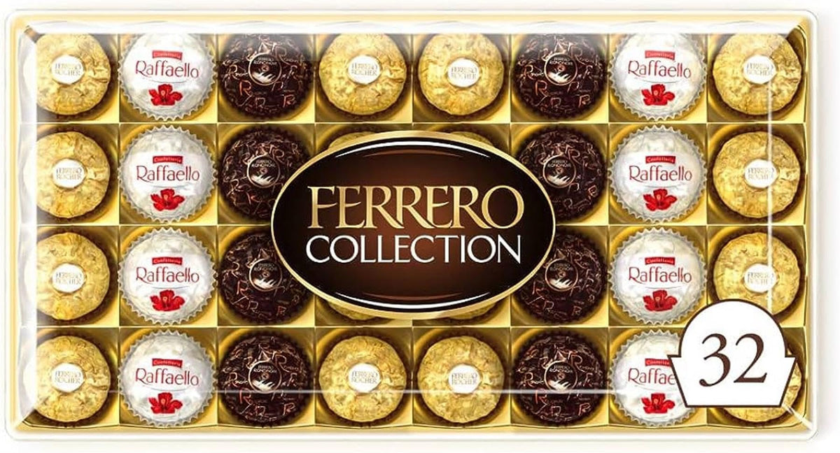 Details: Description With many years experience of producing fine Italian delicacies, Ferrero now offers you a new unique assortment of irresistible specialities. Ferrero Collection: The perfect gift for the ones you love. Each box contains 32 assorted pieces of: Ferrero Rondnoir: A delicious combination of tastes and textures from the fine wafer and rich creamy cocoa filling to a dark chocolate heart. Ferrero Rocher: A whole hazelnut surrounded by delicious layers of crispy wafer, a creamy filling, smooth milk chocolate, and finely chopped hazelnut pieces. Confetteria Raffaello: Delicate layers of wafer, an elegant velvety centre, and toasted almond, all finished with a sprinkling of coconut Ingredients For allergens please see ingredients listed in bold. Ferrero Rocher: Milk Chocolate 30% (Sugar, Cocoa Butter, Cocoa Mass, Skimmed Milk Powder, Concentrated Butter, Emulsifier: Lecithins (Soya), Vanillin), Hazelnuts (28.5%), Sugar, Palm Oil, Wheat Flour, Whey Powder (Milk), Fat-Reduced Cocoa, Emulsifier: Lecithins (Soya), Raising Agent (Sodium Bicarbonate), Salt, Vanillin Ferrero Rondnoir: May Contain Traces Of Almonds And Hazelnuts. Fine Dark Chocolate 40.5% (Sugar, Cocoa Mass, Cocoa Butter, Emulsifier: Lecithins (Soya), Vanillin), Sugar, Palm Oil, Wheat Flour, Fat-Reduced Cocoa Powder, Whey Powder (Milk), Skimmed Milk Powder, Wheat Starch, Sunflower Oil, Milk Chocolate (Sugar, Cocoa Butter, Milk Powder, Cocoa Mass, Emulsifier: Lecithins (Soya), Vanillin), Cocoa Butter, Emulsifier: Lecithins (Soya), Whey Proteins (Milk), Glazing Agent (Gum Arabic), Cocoa Mass, Raising Agents (Sodium Bicarbonate, Ammonium Bicarbonate), Salt, Vanillin Confetteria Raffaello: Desiccated Coconut 25.5%, Vegetable Fats (Palm, Shea), Sugar, Almond (8%), Skimmed Milk Powder, Whey Powder (Milk), Wheat Flour, Tapioca Starch, Flavourings, Emulsifier: Lecithins (Soya), Raising Agent (Sodium Bicarbonate), Salt