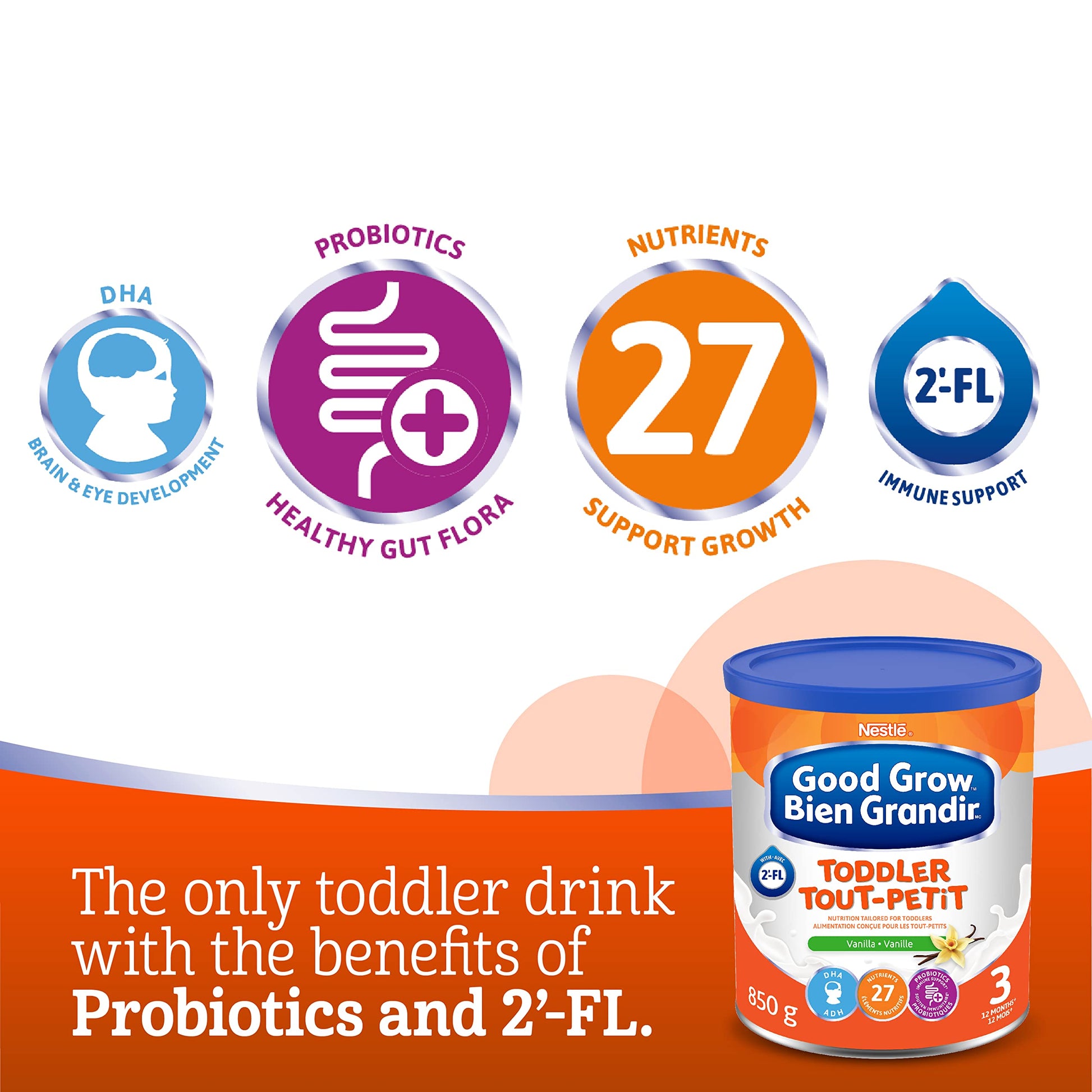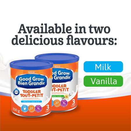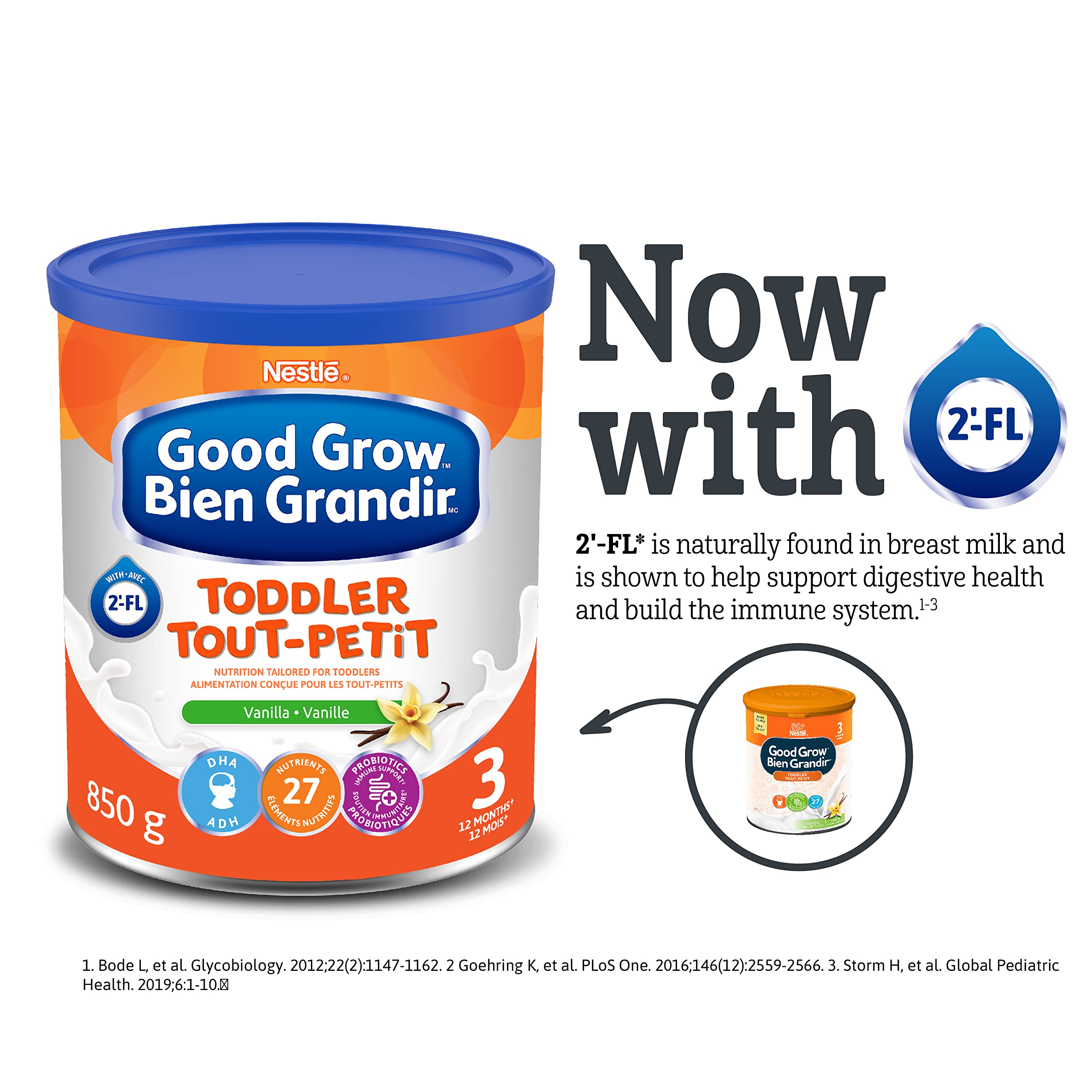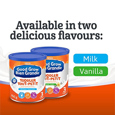 Details: Description NESTLÉ GOOD GROW Stage 3 Nutritional Toddler Drink, 12+ Months, Vanilla Flavour (850 g) is an everyday drink to complement the nutritional needs of toddlers 1 to 3 years old. Unique to NESTLÉ, GOOD GROW contains B. lactis BB-12, a probiotic that helps support normal gut immune function and a healthy gut microflora. This vanilla-flavoured drink is an easy addition to your toddler's diet, and can be served with a meal or as a nutritious snack. NESTLÉ GOOD GROW is made with the goodness of real milk and contains 27 nutrients, including iron, calcium, and vitamin D, which help support your toddler's normal growth and development. It also contains DHA, an Omega 3 fat, to support normal brain and eye development. With B. lactis BB-12, which helps maintain the specific natural digestive tract antibody immunoglobulin A (IgA) that may help support clinical outcomes of normal gut immune function. Primarily in children under 2 years old.