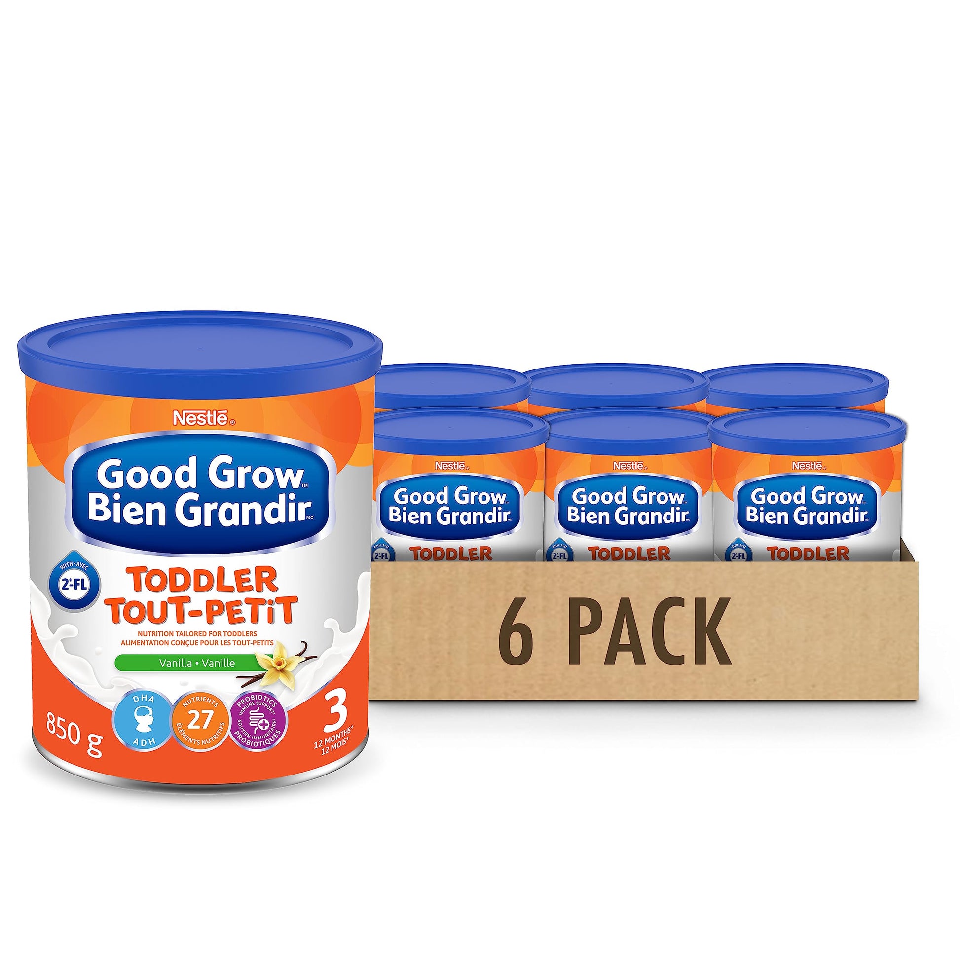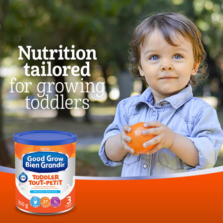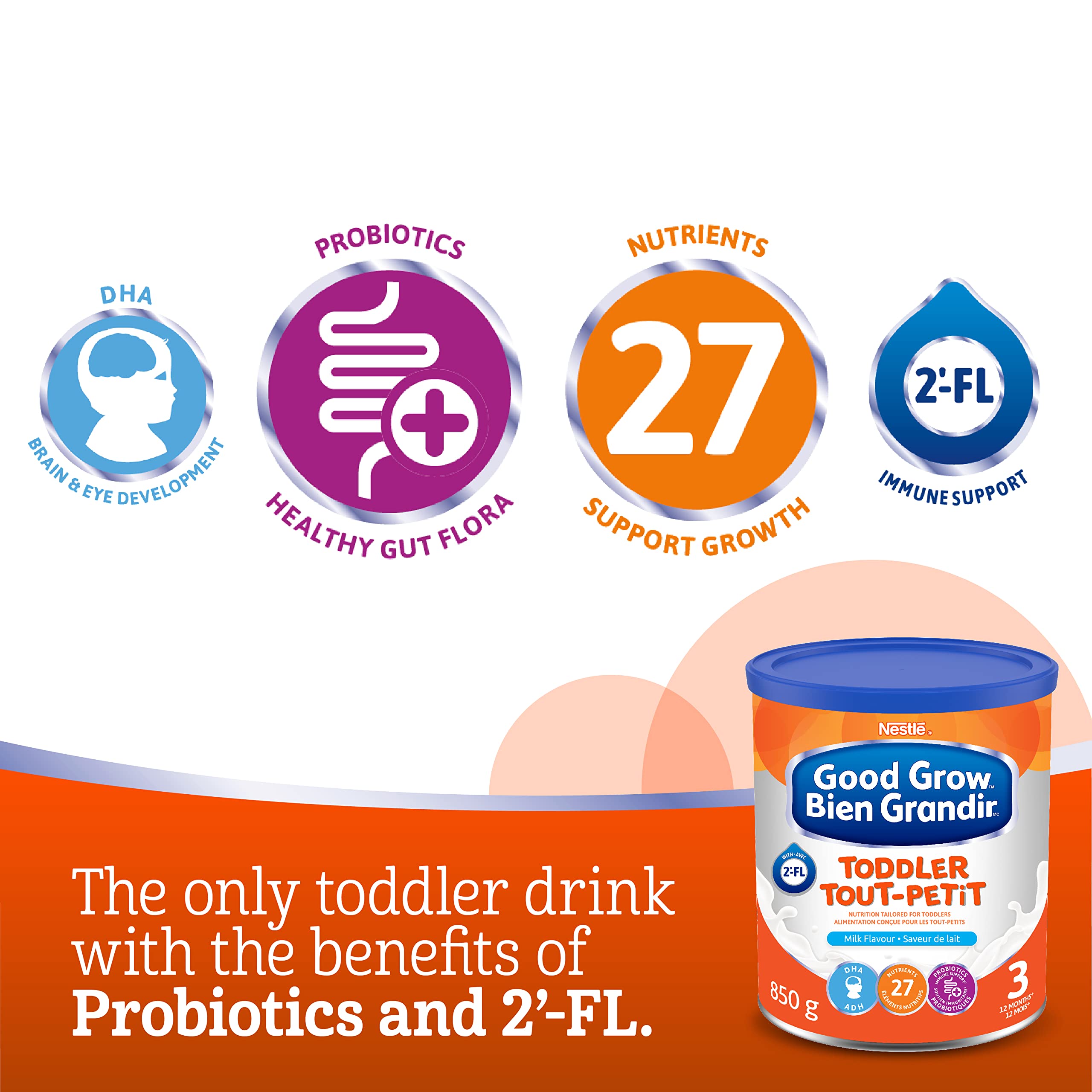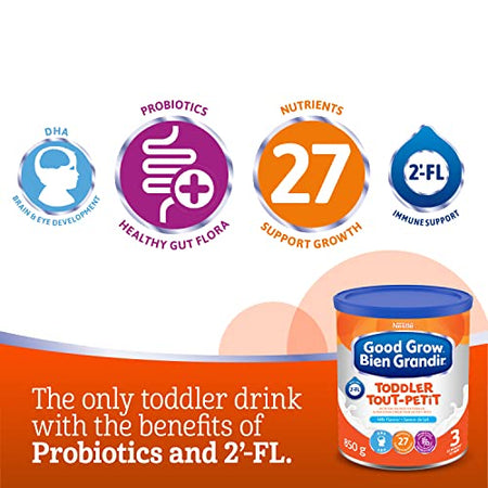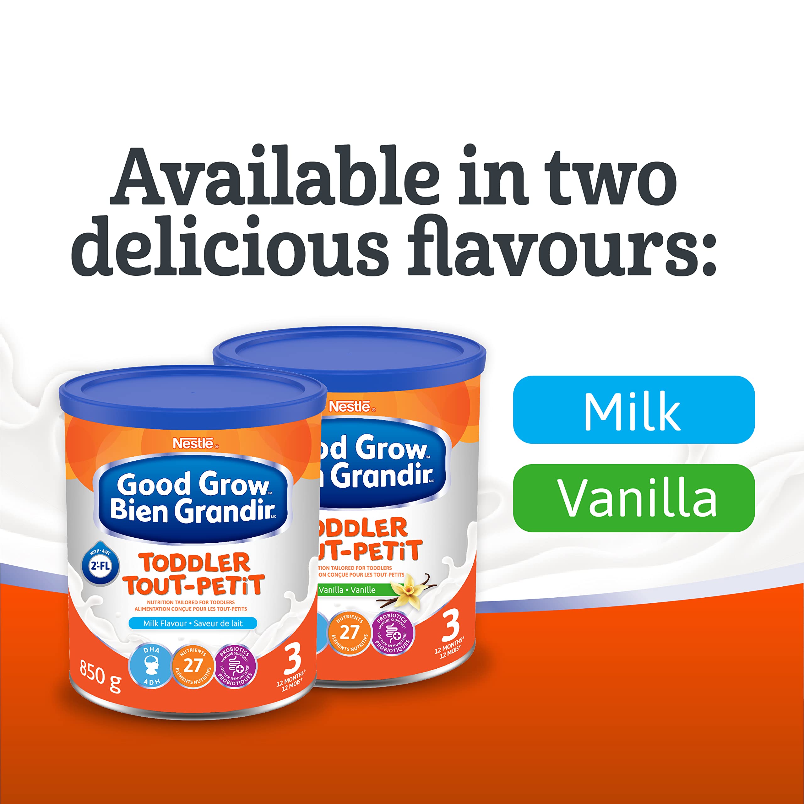 Details: Description NESTLÉ GOOD GROW Stage 3 Nutritional Toddler Drink, 12+ Months, Vanilla Flavour (850 g) is an everyday drink to complement the nutritional needs of toddlers 1 to 3 years old. Unique to NESTLÉ, GOOD GROW contains B. lactis BB-12, a probiotic that helps support normal gut immune function and a healthy gut microflora. This vanilla-flavoured drink is an easy addition to your toddler's diet, and can be served with a meal or as a nutritious snack. NESTLÉ GOOD GROW is made with the goodness of real milk and contains 27 nutrients, including iron, calcium, and vitamin D, which help support your toddler's normal growth and development. It also contains DHA, an Omega 3 fat, to support normal brain and eye development. With B. lactis BB-12, which helps maintain the specific natural digestive tract antibody immunoglobulin A (IgA) that may help support clinical outcomes of normal gut immune function. Primarily in children under 2 years old.