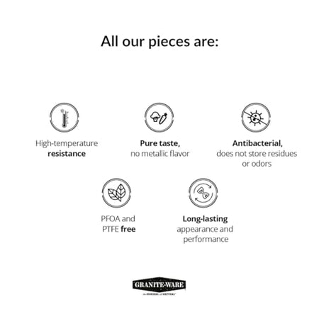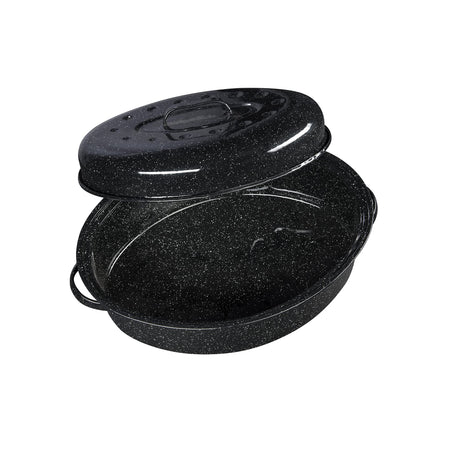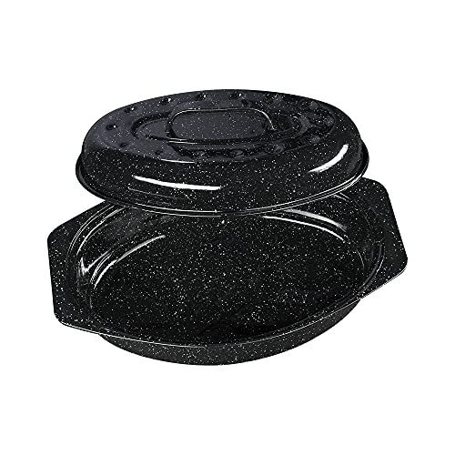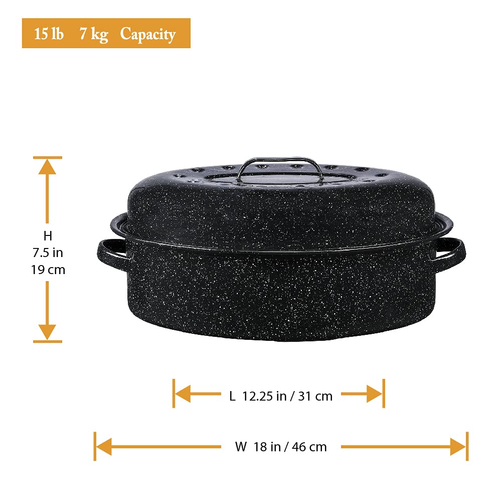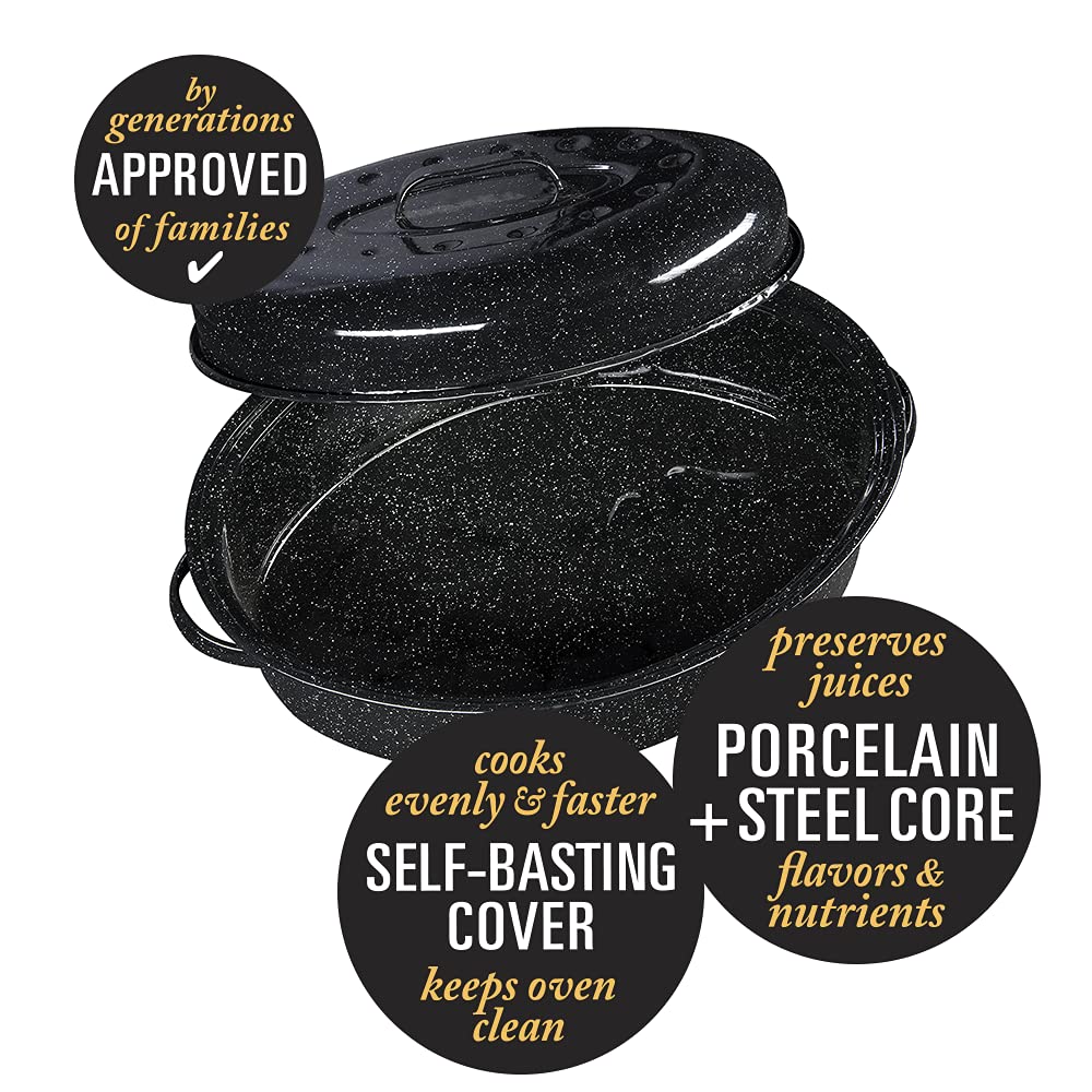 Details: Granite Ware roasters brown better and cook more evenly than any other roaster. The dark exterior absorbs all the oven's energy, the steel core evenly distributes the heat and the glass interior doesn't alter the taste.