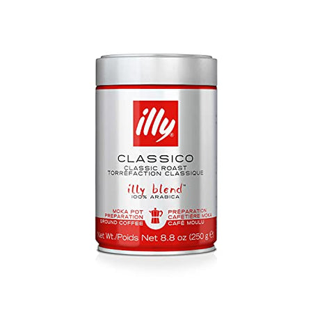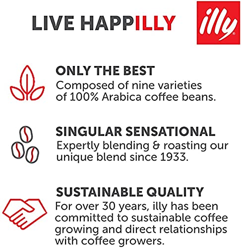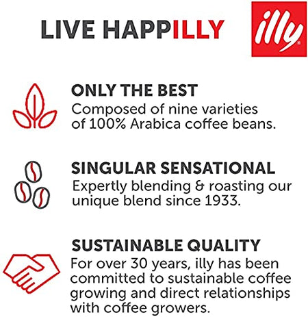 Details: lly ground espresso coffee is finely ground to provide optimal extraction with espresso machines that accept ground, tamped coffee. illy’s distinctive blend of fine Arabica coffees with a smooth, rich and full-bodied taste is created from the skillful blending of 100% sustainably-grown Arabica beans, meticulously selected from different growing regions around the world. The result is an authentic Italian coffee that is flawlessly consistent, smooth, balanced, and never bitter. Using an exclusive process, illy coffee is packed in an air-free, pressurized can that enhances and seals in the precious aromas and oils, so you enjoy the freshest taste – cup after cup