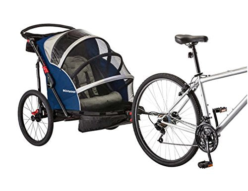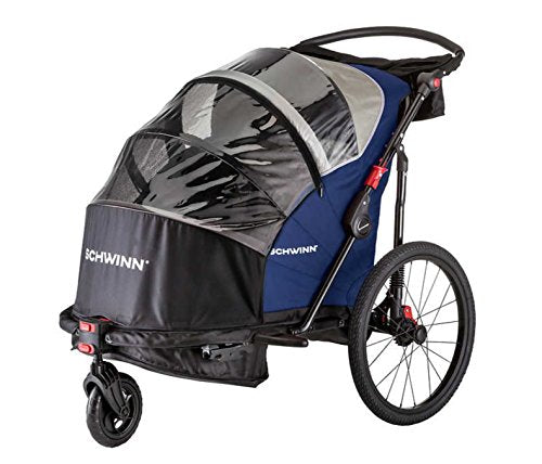 Details: The Joyrider Double Bike Trailer from Schwinn is the best way to enjoy a bike ride with little ones who are too young to pedal on their own. The Joyrider also acts as a stroller for your morning jog thanks to the included stroller handle and quick-release front swivel tire. You can bike with confidence knowing your passengers are strapped in with the five-point adjustable safety harness and padded shoulder straps. Lightweight and durable thanks to the aluminum frame, the Joyrider conveniently folds up for compact storage on your next family road trip.