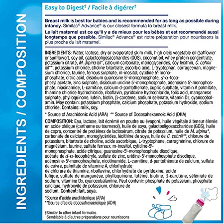 Details: Similac offers you a family of products specially designed to meet the unique needs of your baby. The first years of a baby's life are a critical time for brain and eye development. Your baby’s nutrition plays an important role during this development. Similac Advance Step 1 baby formula can be there for you and your baby to provide the nutrition needed during this important period of growth. Our baby formula contains an exclusive blend of DHA, lutein and natural vitamin E† to help provide your baby with nutrition beyond DHA. DHA is a type of omega-3 fat that's found in breast milk and is an important building block for your baby's brain and eyes. Similac Advance Step 1 is available in this concentrated liquid format as well as in easy-to-scoop powder tubs and convenient ready-to-use bottles. It is recommended for babies 0+ months. It is kosher and gluten-free. What a great place to start with baby formula!‡ † RRR-α-tocopherol, the most bioactive form of vitamin E. ‡ Breast milk is best for babies. Beverage container material - Plastic.