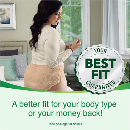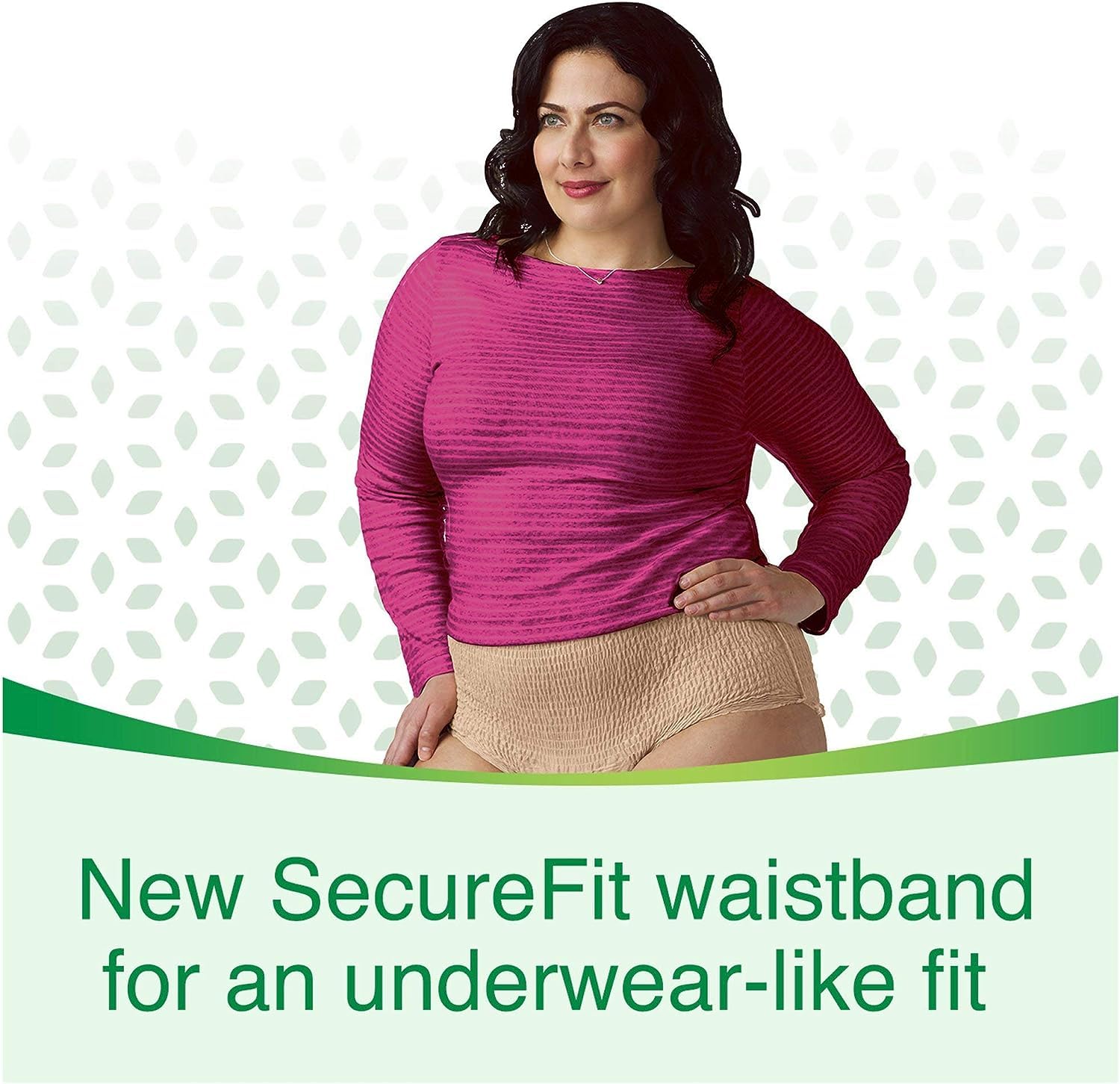 Details: Description Depend Fit-Flex Women’s Incontinence Underwear is extremely soft, yet strong and keeps you protected from bladder leaks with DryShield Technology, providing you all day comfort, guaranteed. Absorbent material instantly locks in wetness and odors, providing long lasting dryness and a more comfortable experience. Designed with the SureFit waistband to help keep it in place and form-fitting elastic strands to provide a discreet fit under clothing, unlike bulky adult diapers. This disposable underwear is available in a beautiful blush color and three feminine designs. This unscented underwear is soft, quiet and breathable.